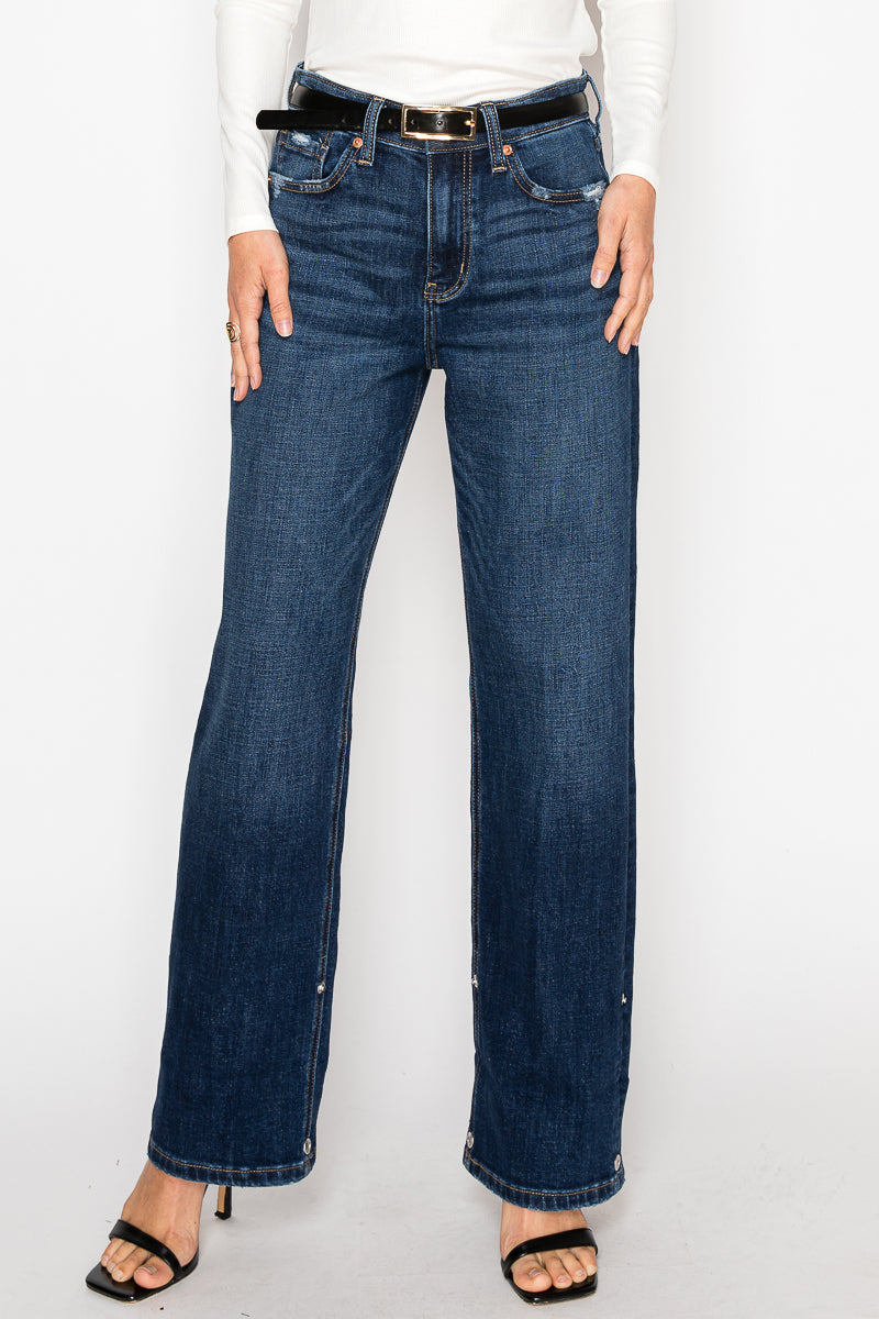 A modern high-rise ankle jean with a relaxed straight leg and finished cuff. The dark stone wash adds vintage character, while the ankle length keeps it polished and chic for everyday wear.