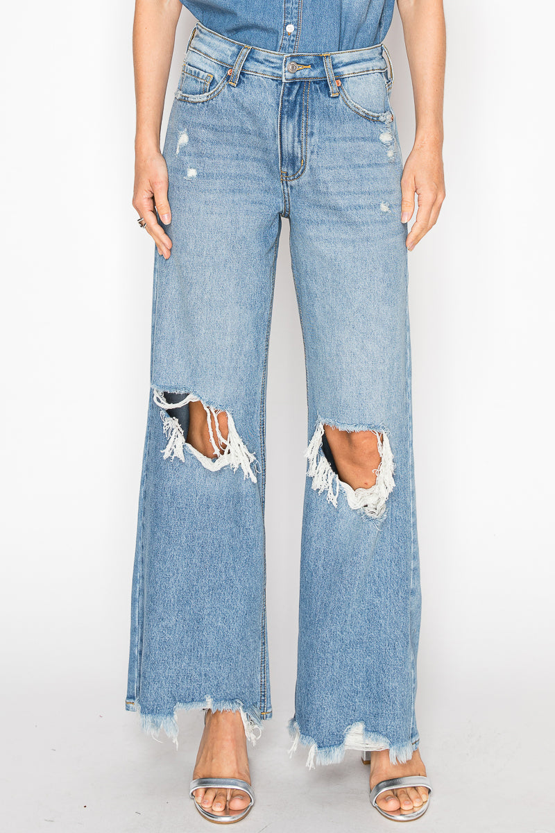 Designed with a modern vintage edge, this ultra high-rise relaxed flare jean makes a bold statement. The exaggerated knee destruction and frayed hemline bring a lived-in, authentic feel, while the medium stone wash ensures timeless versatility. Perfectly balanced between relaxed ease and elevated styling, it’s a standout piece that captures both comfort and character.